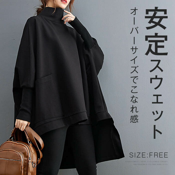 トレーナー レディース ハイネック ドルマン トップス 長袖 秋 春 冬 チュニック 前後差 不規則・・・