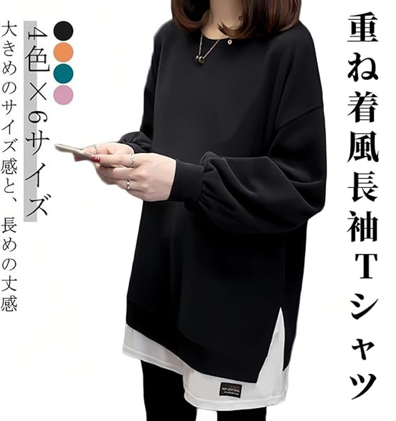 トレーナー レディース レイヤード 重ね着風 スウェット トップス 無地 長袖 チュニック プルオー・・・