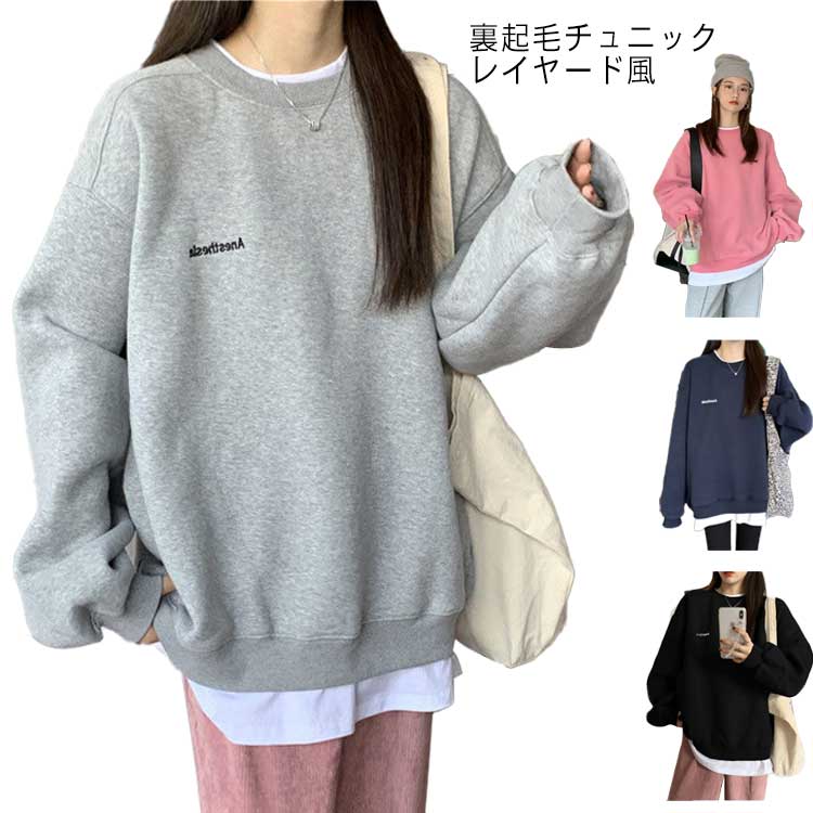 秋 トップス プルオーバー スウェット 裏起毛 コットン トレーナー レイヤード風チュニック チュニ・・・