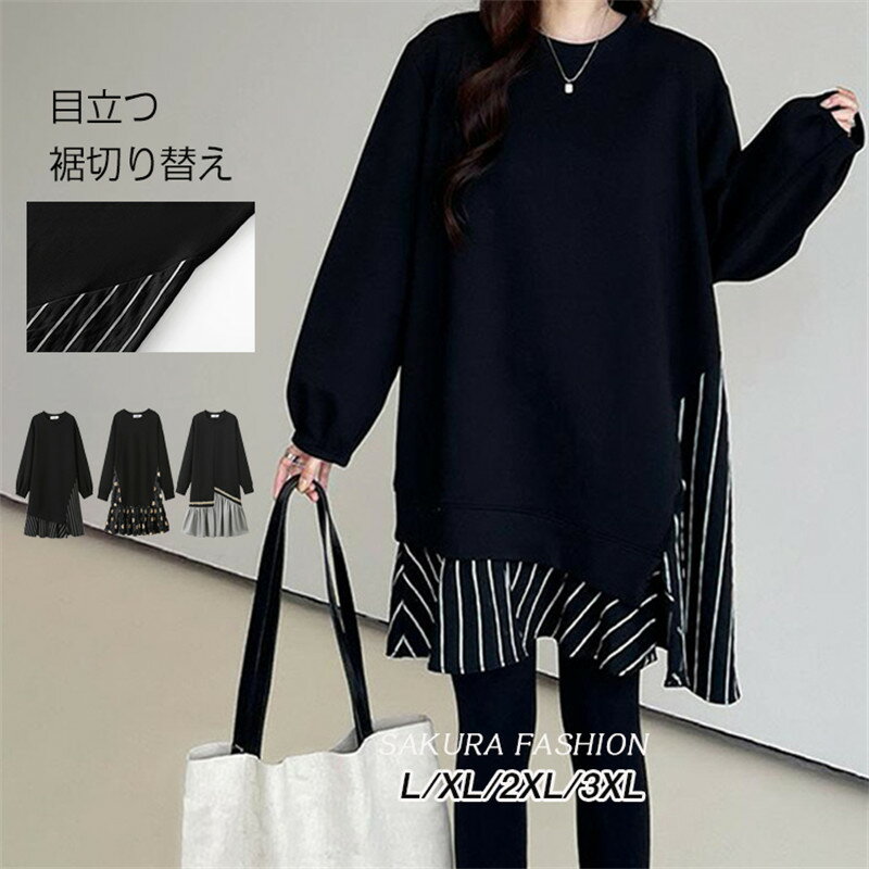 大きいサイズ チュニック レディース サイド切り替え トップス スウェット トレーナー 長袖 スエッ・・・