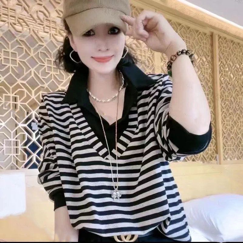 レディース トップス カジュアル 春秋 ゆったり 可愛い 大きいサイズ ボーダー柄 重ね着風