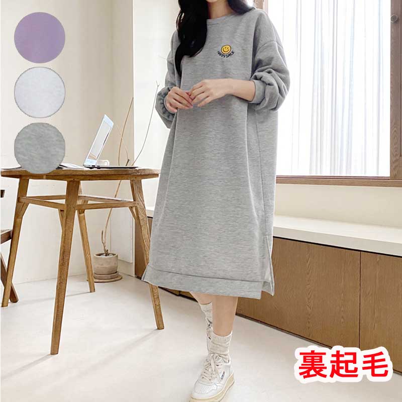 ワンピース 裏起毛 スマイル&英字 刺繍 スリット入り 長袖 スウェット