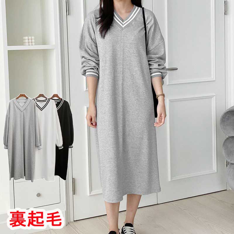 裏起毛 ワンピース Vネック ライン入り スウェット 無地 ゆったり