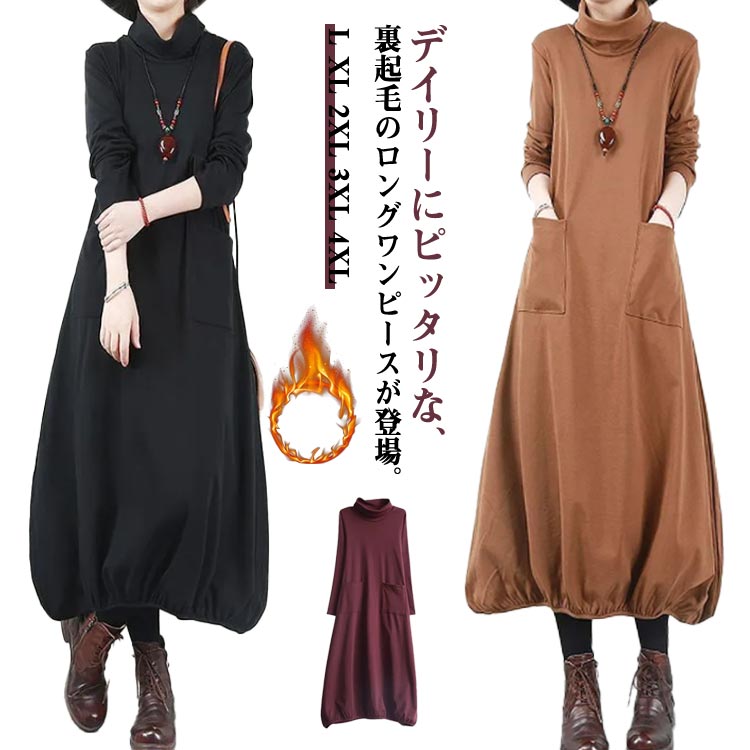 秋冬 長袖 ワンピース 裏起毛 スウェット 防寒 ハイネック ワンピース あったか 暖かい ロング丈・・・