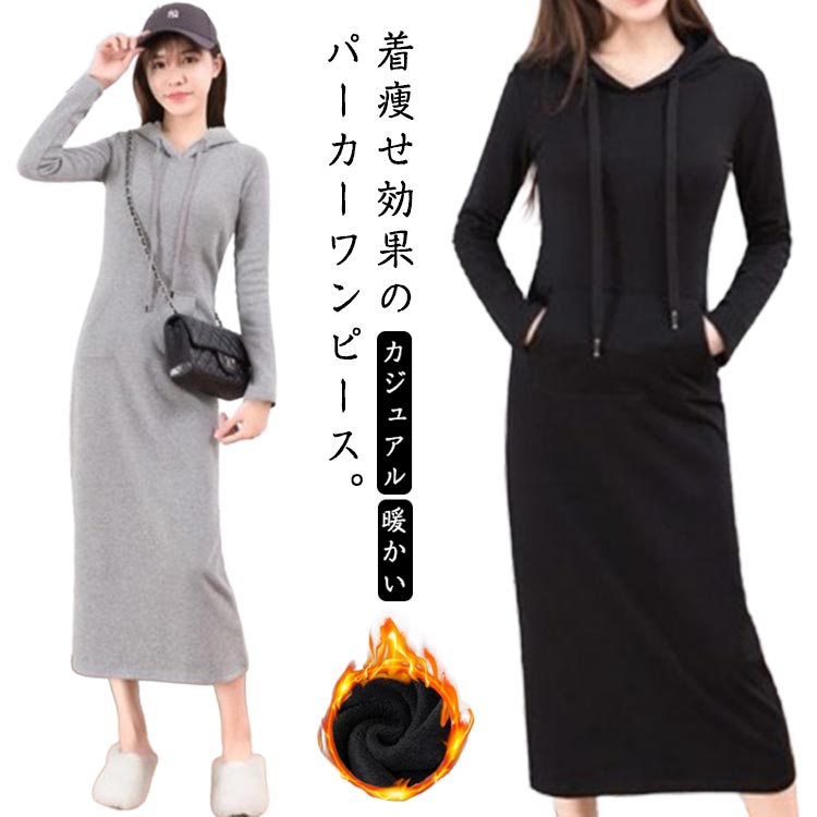 ワンピース 裏起毛 秋冬 冬服 レディース パーカーマキシワンピース 暖か 長袖 膝下丈 フード付き・・・