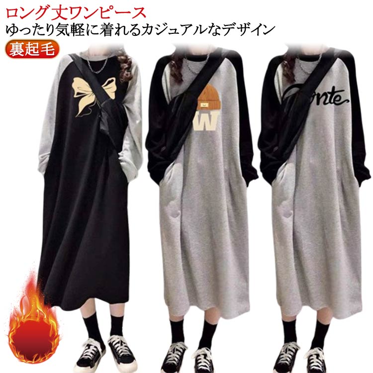 裏起毛 スウェット 送料無料 ロング丈 長袖 ワンピース レディース トレーナー ゆったり 配色 ワ・・・