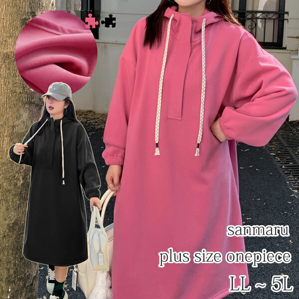 大きいサイズ ワンピース 裏起毛 刺繍入りロングコード付き フード付き ハーフジップ スウェットワン・・・
