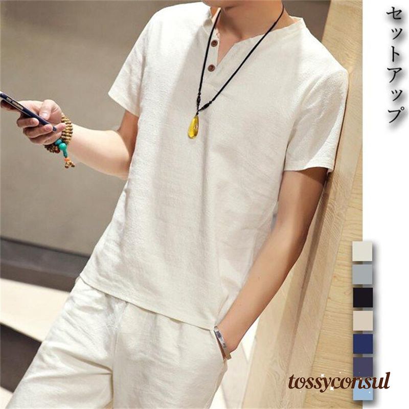 メンズ 半袖上下セット セットアップ カジュアル 夏服 ボトムス 半ズボン 短パン クールネック ジ・・・