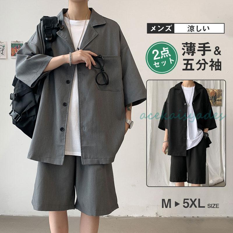 半袖シャツ 上下セット メンズ セットアップ 五分袖 薄手 ハーフパンツ 2点セット 羽織 夏 短パ・・・