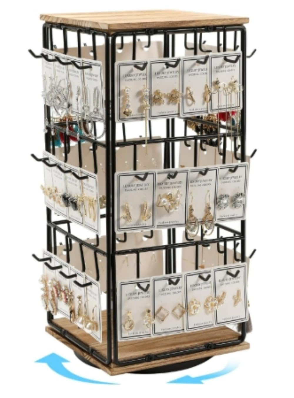 360度回転 フック付き ジュエリースタンド カウンタートップイヤリングラック 木材、回転ホルダー ・・・