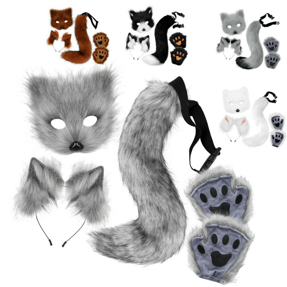 4点セット コスプレ道具 カチューシャ&マスク&しっぽ&手袋セット オオカミ ハスキー きつねみみ ・・・