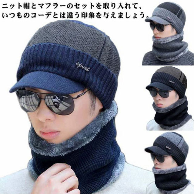 つば付き ニット帽 ネックウォーマー メンズ 2点セット ゴルフ キャップ 秋 冬 冬帽子 帽子 裏・・・