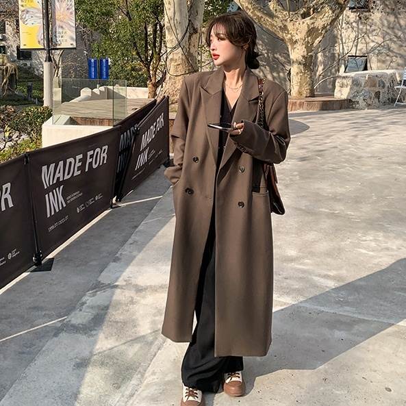 アウター スプリングコート ロング丈 長袖 Vネック 襟付き ストレート ポケット 前開き ボタン ・・・