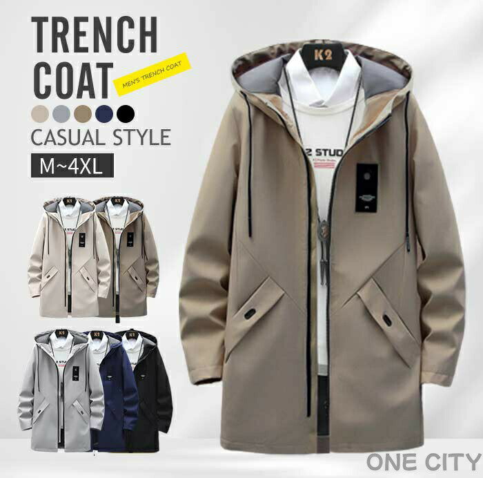 M-4XL トレンチコート メンズ アウター フード付き カジュアルジャケット ジップアップ ミドル・・・