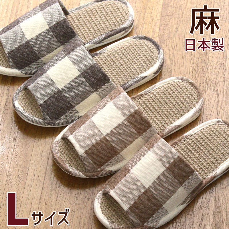 スリッパ 麻中 ブロックチェック柄 L ナチュラル 格子 夏用 室内 メンズ 紳士 来客用 前開き ・・・