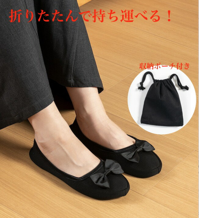 【正規品 365日出荷】携帯 スリッパ 黒 折りたたみ ルームシューズ バレエシューズ リボン レデ・・・