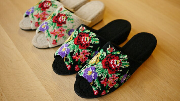 【おしゃれな特別のヒールスリッパ】日本製 シェニールブーケ ヒール カラー2色(ベージュ、ブラック)・・・
