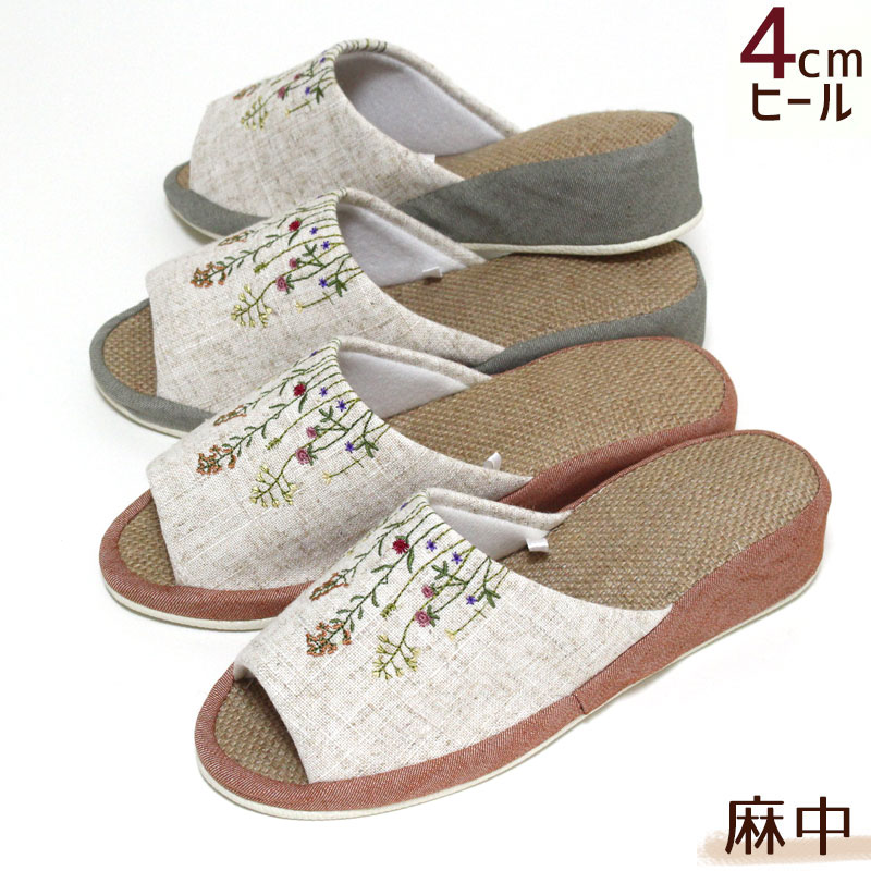 ヒールスリッパ ハーブ刺繍 麻中 ヒール高約4cm 花 ナチュラル おしゃれ