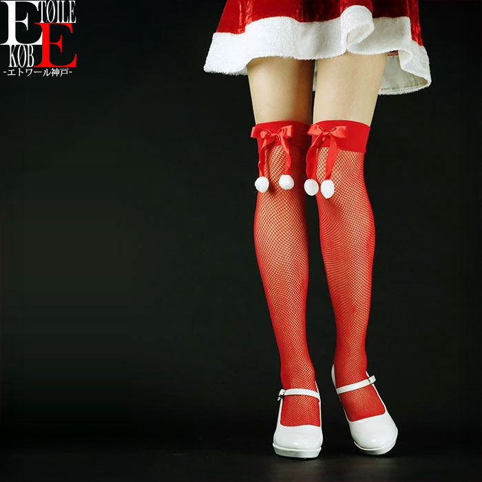 網タイツ/白色ボンボン付きリボン 赤色 サイハイ パンスト/クリスマス/サンタ コスプレにも タイツ・・・