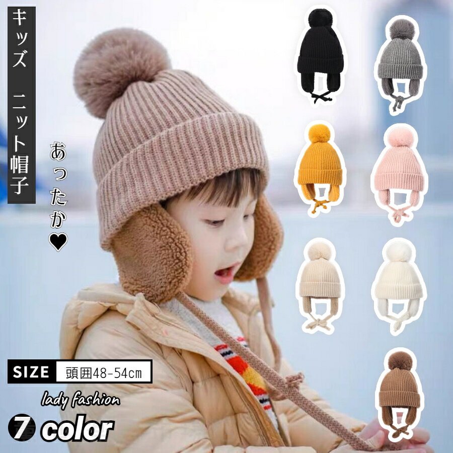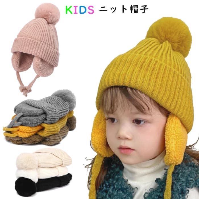 キッズ ニット帽 女の子 男の子 耳あて 防寒帽子 ベビー 防寒 ボア ポンポン イヤーマフ付ニット・・・