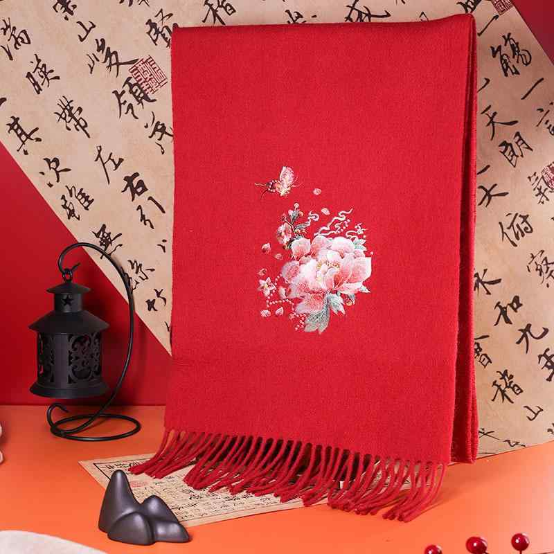 マフラー レディース 女性用 秋冬 防寒 保温 100%ウール 羊毛 上質 なめらか 刺繍 花柄 牡・・・