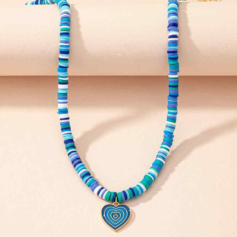 ネックレス クラインブルー ハート ポリマークレイ 陶器 米ビーズ カラフル ロングネックレス 民族・・・