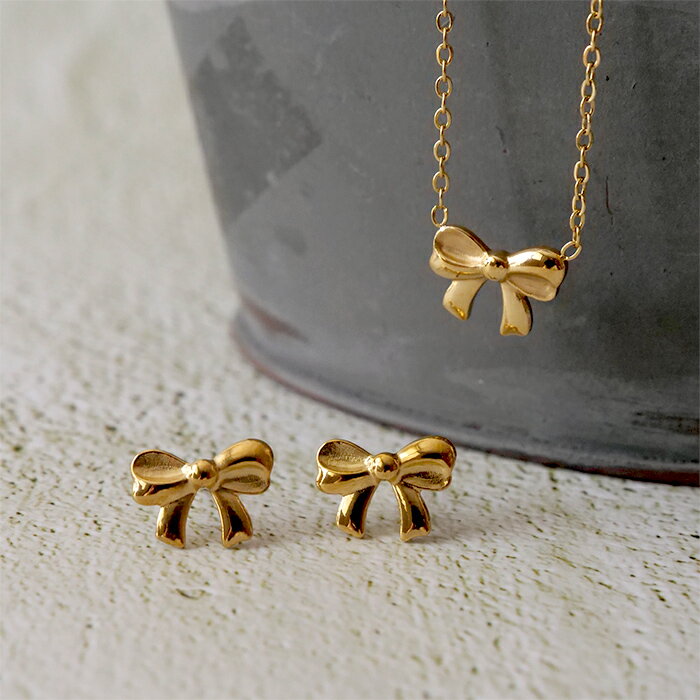【金属アレルギー対応】 03.ステンレス セット ネックレス ピアス リボン平 ゴールド 国内発送【・・・