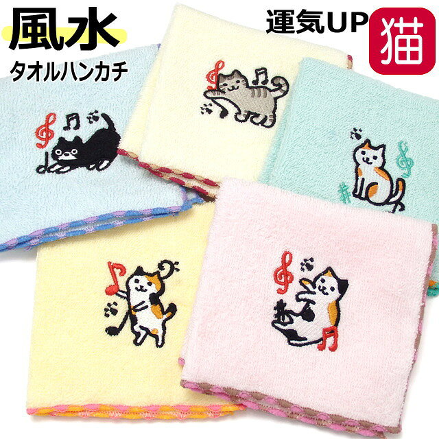 タオルハンカチ 小さめ 風水 猫柄 雑貨 グッズ 綿100% コットン やわらか パイル ハンカチ ・・・