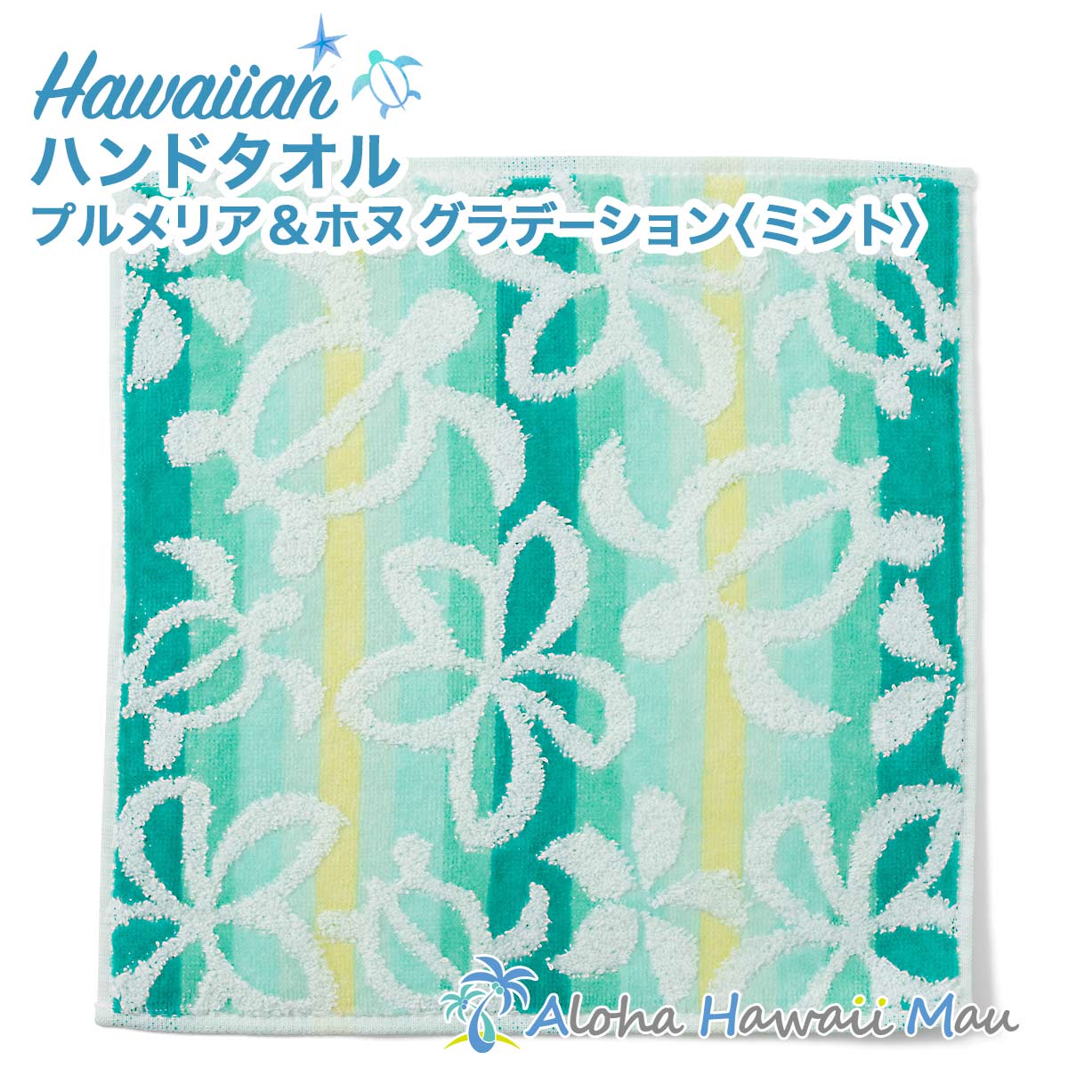 ハワイアン ハンドタオル プルメリア&ホヌ グラデーション タオルハンカチ ミント ホヌ柄 かわいい・・・