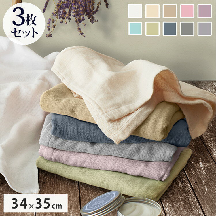ガーゼタオル ハンドタオル 3枚セット 全10色 片面ガーゼ 薄手 34×35cm タオル しっかり・・・