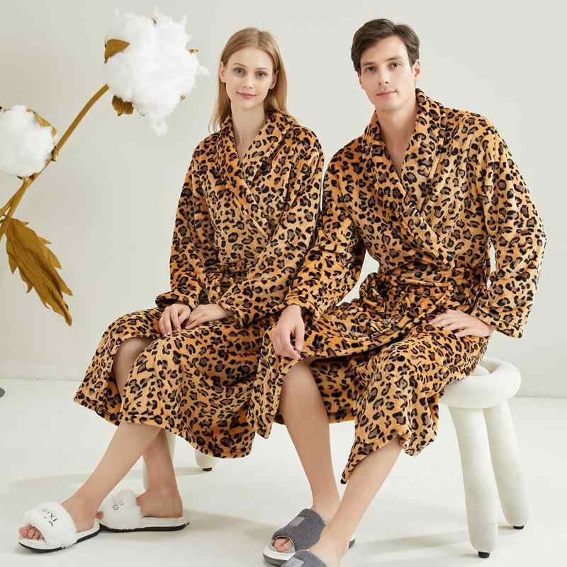 バスローブ 男女兼用 ペア 厚手 フランネル ポリエステル あったか 秋冬 ヒョウ柄 紺色 黒色 グ・・・