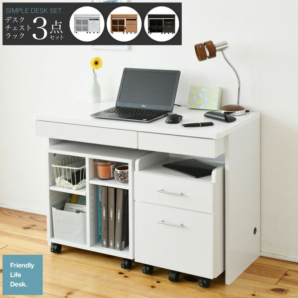 シンプル デスクセット 3点セット デスク チェスト テレワーク 机 ホワイト 収納付き 省スペース・・・