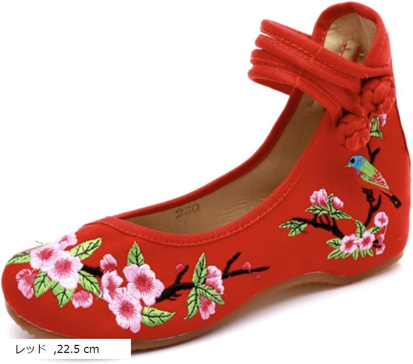 チャイナシューズ フラットシューズ 花刺繍 中華風 インヒール レディース(レッド, 22.5 cm・・・