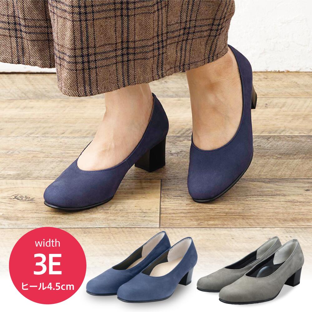 3E プレーンパンプス 返品交換可 ヌバックチャコール ネイビー シンプル 安定感 ヒール4.5cm・・・