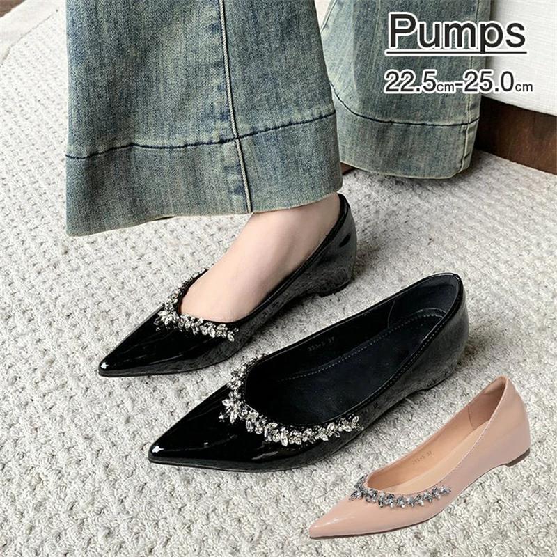 美脚 シャープなポインテッドトゥ ビジューの装飾 パンプス 痛くない 通勤用 インヒール4cm ライ・・・