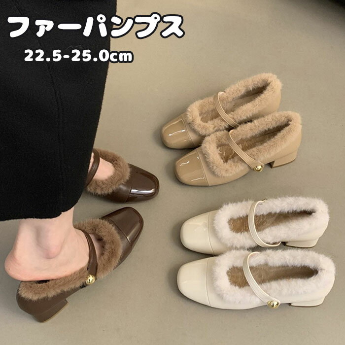 ファーパンプス レディース ローファーシューズ 裏起毛 裏ボア フェイクファー 太めヒール 保温 防・・・