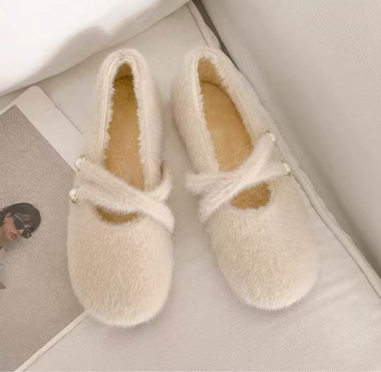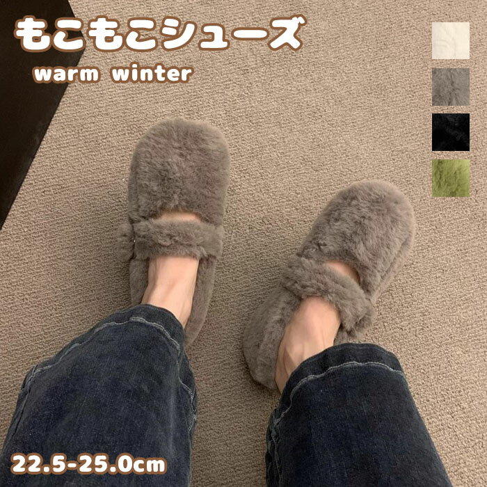 ファーパンプス 滑り止め 歩きやすい もこもこ ふわふわ フラットシューズ 裏起毛 裏ボア フェイク・・・