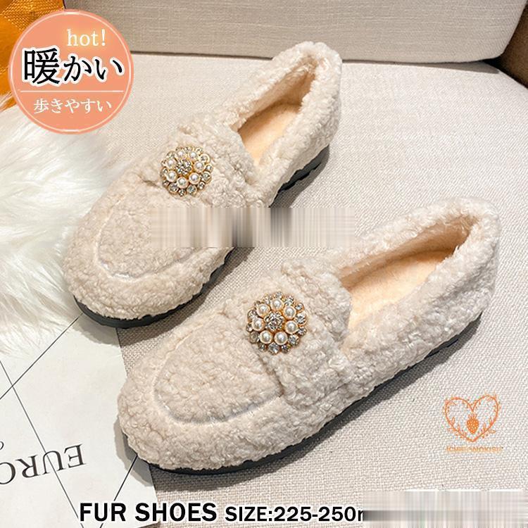 ファーパンプス レディースシューズ 歩きやすい 裏起毛 モカシン エコボアパンプス ぺたんこ スリッ・・・