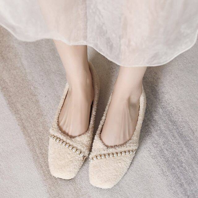 レディースパンプス 柔らか スクエアトゥ ボア フラットシューズ ローヒール 室内履き ぺたんこ パ・・・