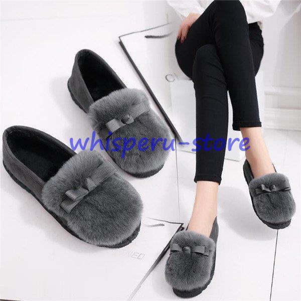 ファーモカシンファーパンプスリボンパールファースリッポンシューズ内ボアあったかいぺたんこローヒールレ・・・