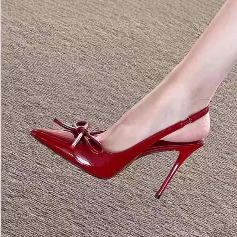 サンダル レディース 夏 ポインテッドトゥ ミュール ハイヒール ピンヒール ボルドー リボン フレ・・・