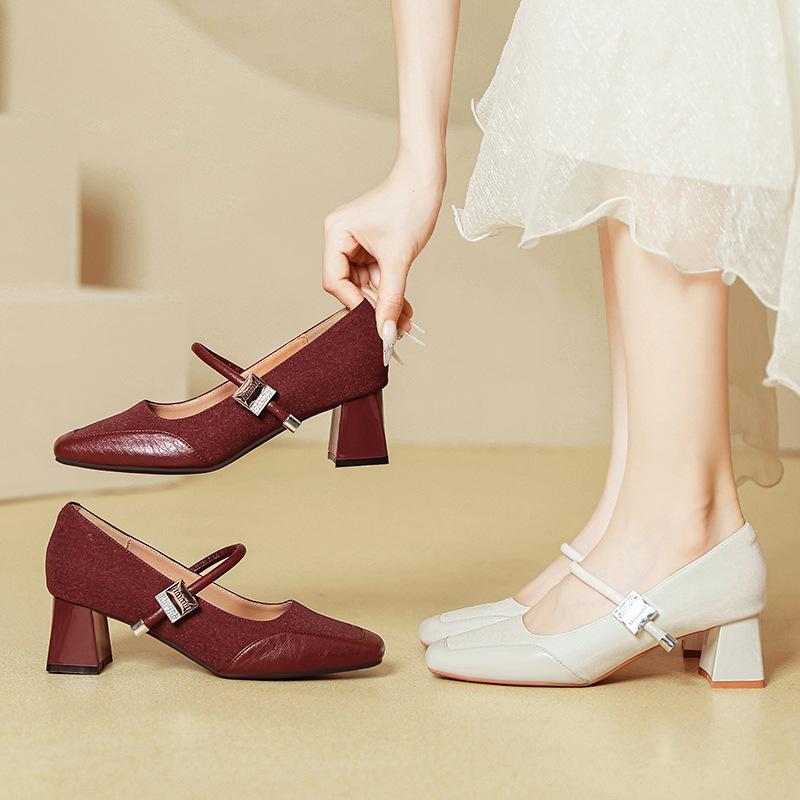 パンプス レディース メリージェーン スクエアトゥ ワンストラップ 浅履き ミドルヒール 太ヒール ・・・