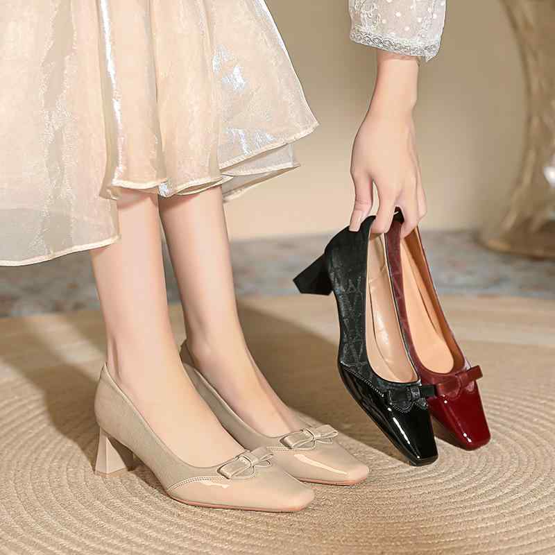 パンプス レディース フレンチスタイル 太ヒール チャンキーヒール ミドルヒール リボン 切り替え ・・・