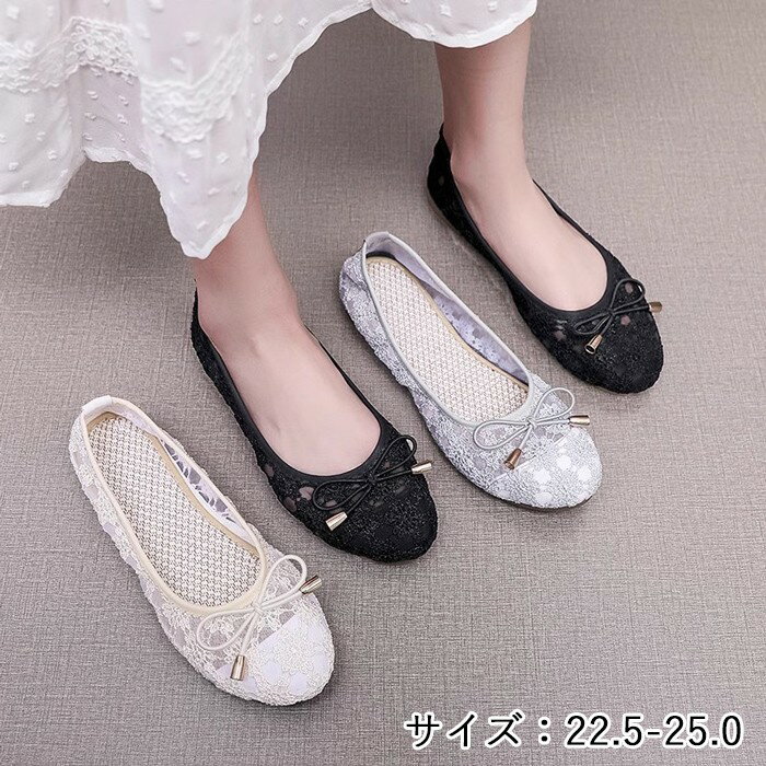 ラウンドトゥ パンプス 履きやすい レディース フラットヒール ぺたんこ ローヒール 総レースパンプ・・・