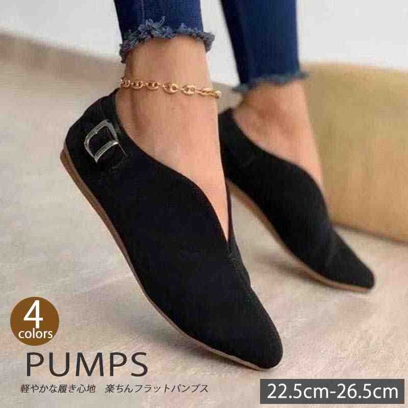 レディース パンプス フェイクレザー 靴 黒 フラット ぺたんこ スリッポン 歩きやすい Vカット【・・・
