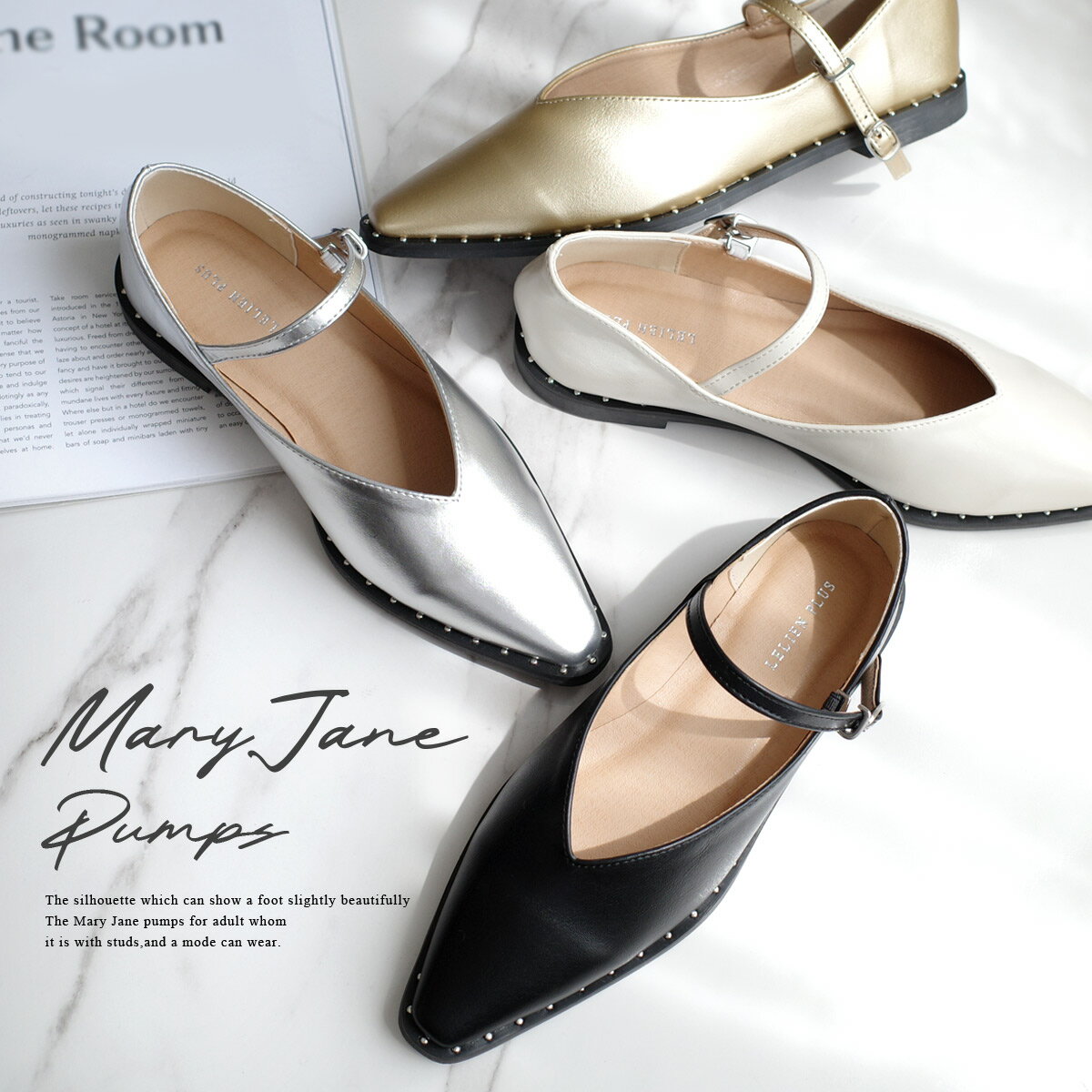 パンプス ローヒール ポインテッドトゥ メリージェーン スタッズ Vカット 1.5センチヒール スト・・・