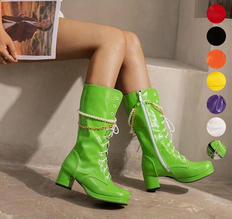送料無料 ロングブーツ 編み上げ ヒール5.5センチ 太ヒール ブーツ 美脚 カジュアル レディース・・・