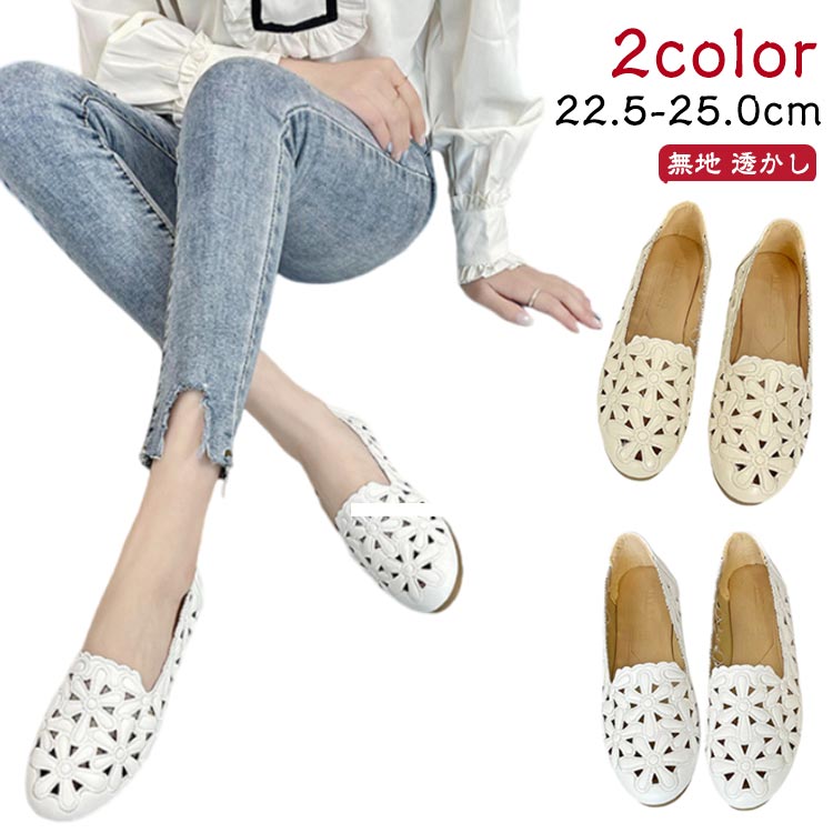 透かし彫り 花柄 幅広 カットワーク スリッポン 甲高 フラットパンプス フラットシューズ レディー・・・