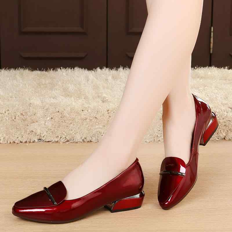 パンプス レディース 春夏 太ヒール ミドルヒール 革 エナメル ラウンドトゥ スリッポン 浅履き ・・・