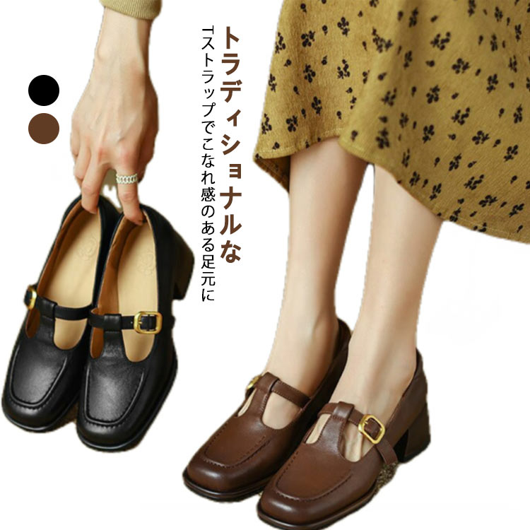 ローファー Tストラップ 太ヒール 4.5cm スクエアトゥ 痛くない レディース パンプス 茶色 ・・・